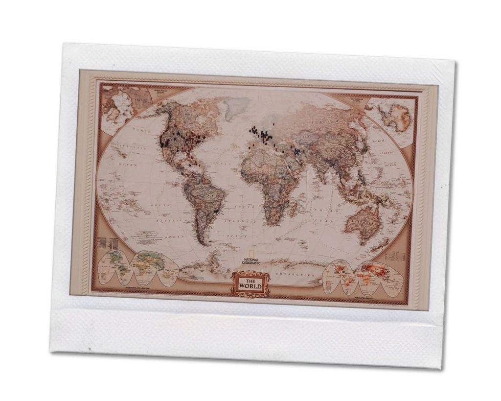 I first came up with the name because of a vintage-style map I had glued to foam board in my old bedroom at my parents’ house. I would get so much joy from pinning all the places on the map where I had been, and this is a tradition that continues to this day for my family of three.